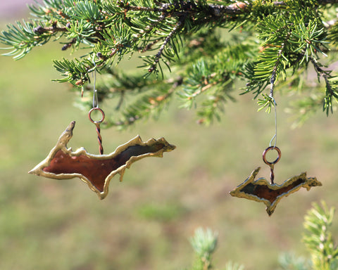 Large Copper Ornament of Michigan's Upper Peninsula. Edges are brazed and torching adds color to the copper. Comes with a braided stem as the hook.