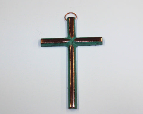 Medium 9" solid copper cross with patina and selective polish. Each cross is individually cast, patina applied, and then hand polished to a mirror finish to accent the solid copper.