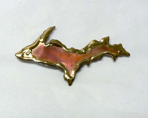 Handmade Copper Art Michigan magnet. This artistic piece is made from heating and fabricating sheet copper to create this Upper Michigan shaped magnet. Copper is heated to create many colors. The piece is approximately 3"L x 1.5"W. Each piece is individually handcrafted and unique, and the photo shows a representative sample.