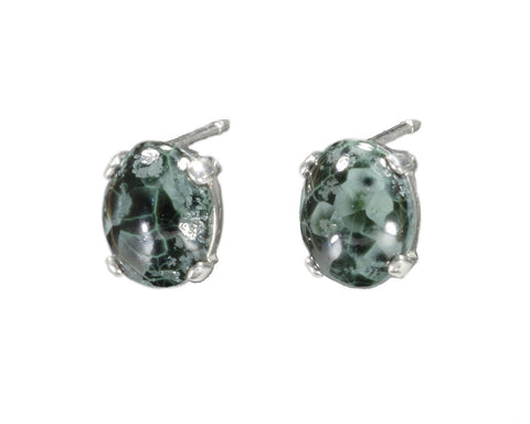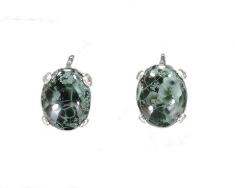 10x8mm Greenstone Earrings in Sterling Silver 4-prong post settings. -Chlorastrolite (Greenstone) is the "official state gem" of Michigan. It is a variety of the mineral pumpellyite and is found chiefly as a small, green, rounded beach pebble, showing a turtleback pattern. Greenstones can still be seen on Isle Royale and...