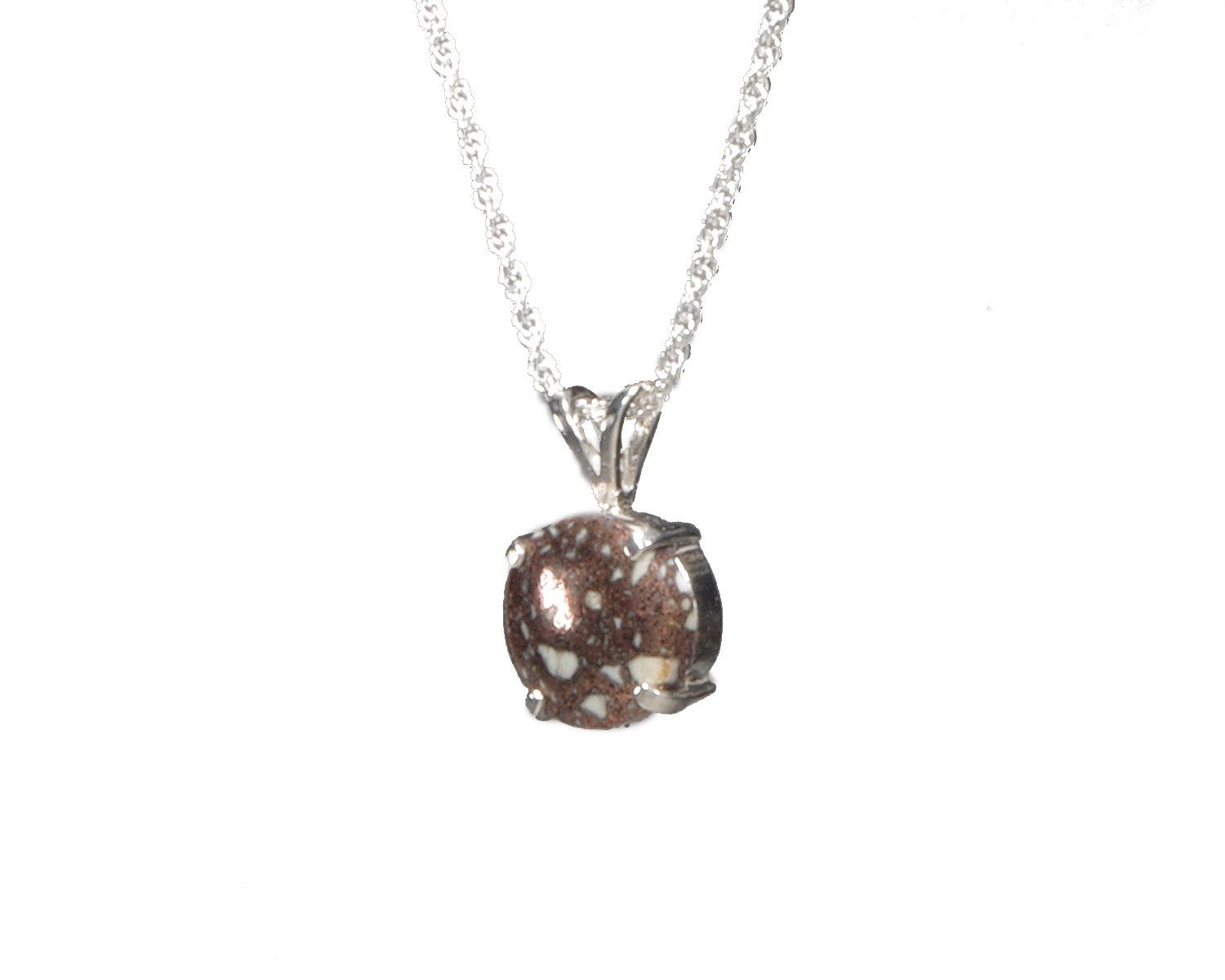 A 10mm round Copper Firebrick pendant in a sterling silver 4-prong setting.