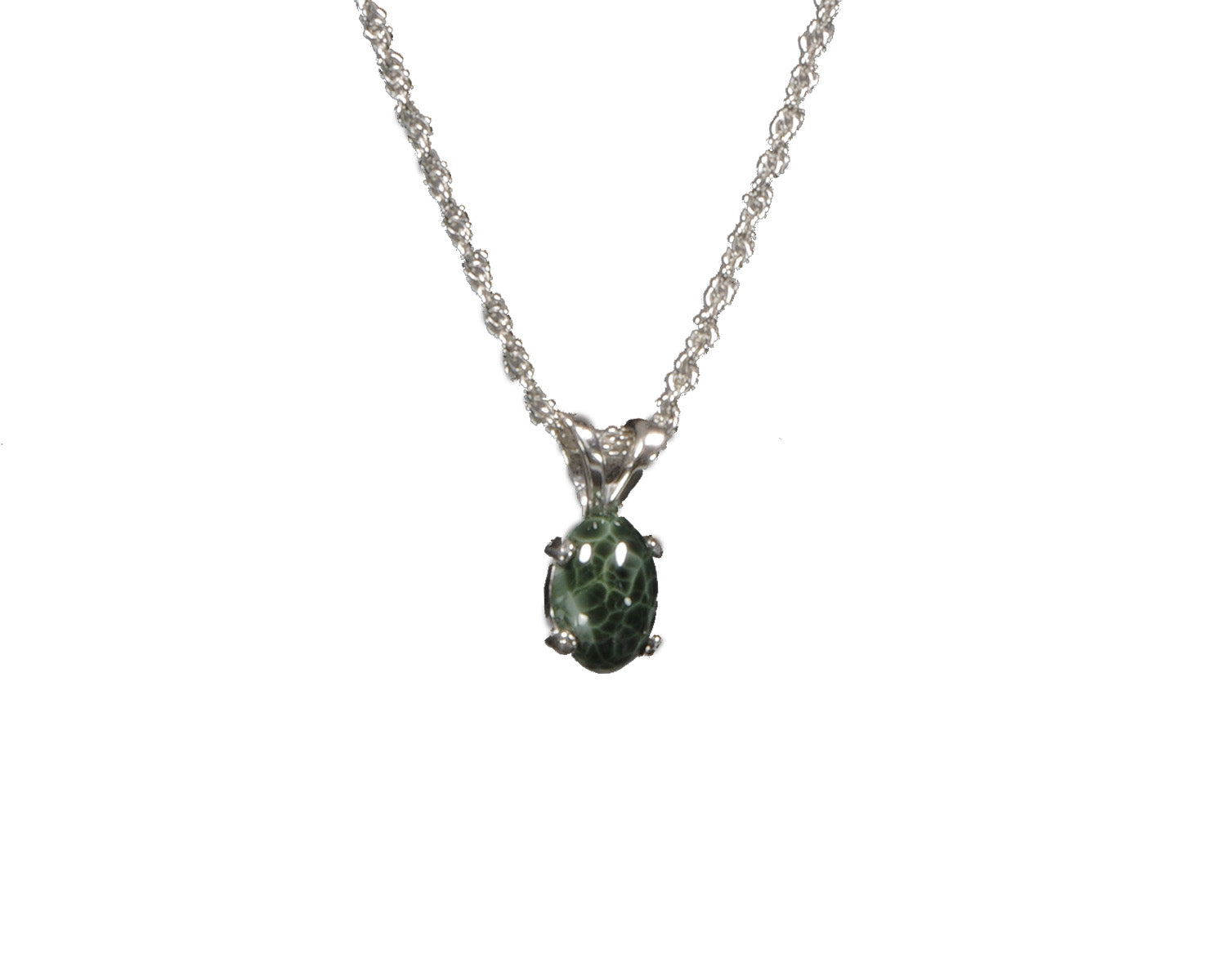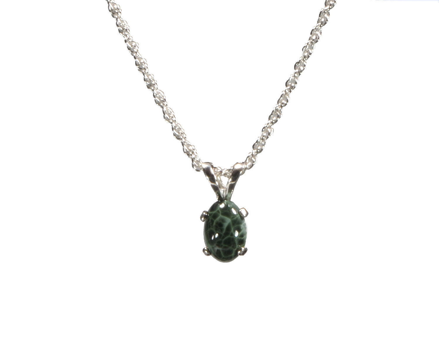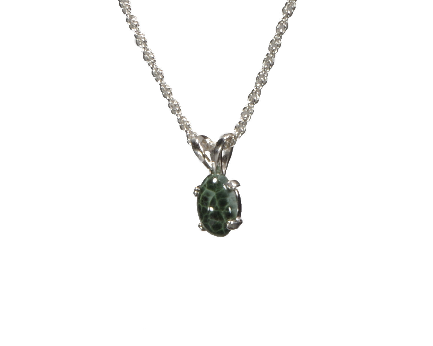 A 7mm x 5mm Greenstone pendant in a sterling silver 4 prong setting.