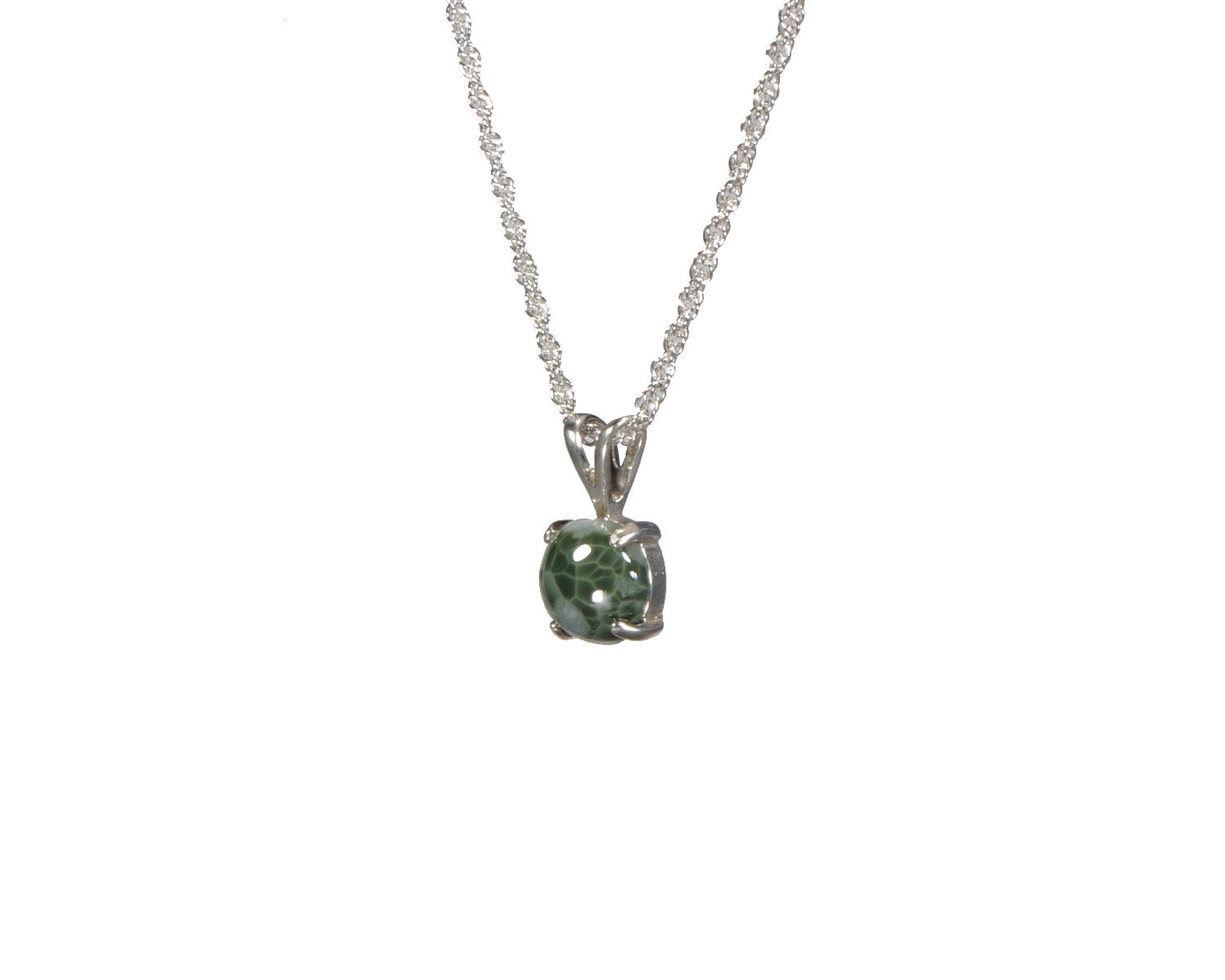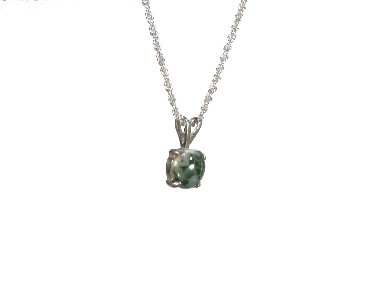 7 mm Greenstone pendant in a sterling silver 4 prong setting. Includes a 18" Sterling Silver chain with a spring ring clasp. -Chlorastrolite (Greenstone) is the "official state gem" of Michigan. It is a variety of the mineral pumpellyite and is found chiefly as a small, green, rounded beach...