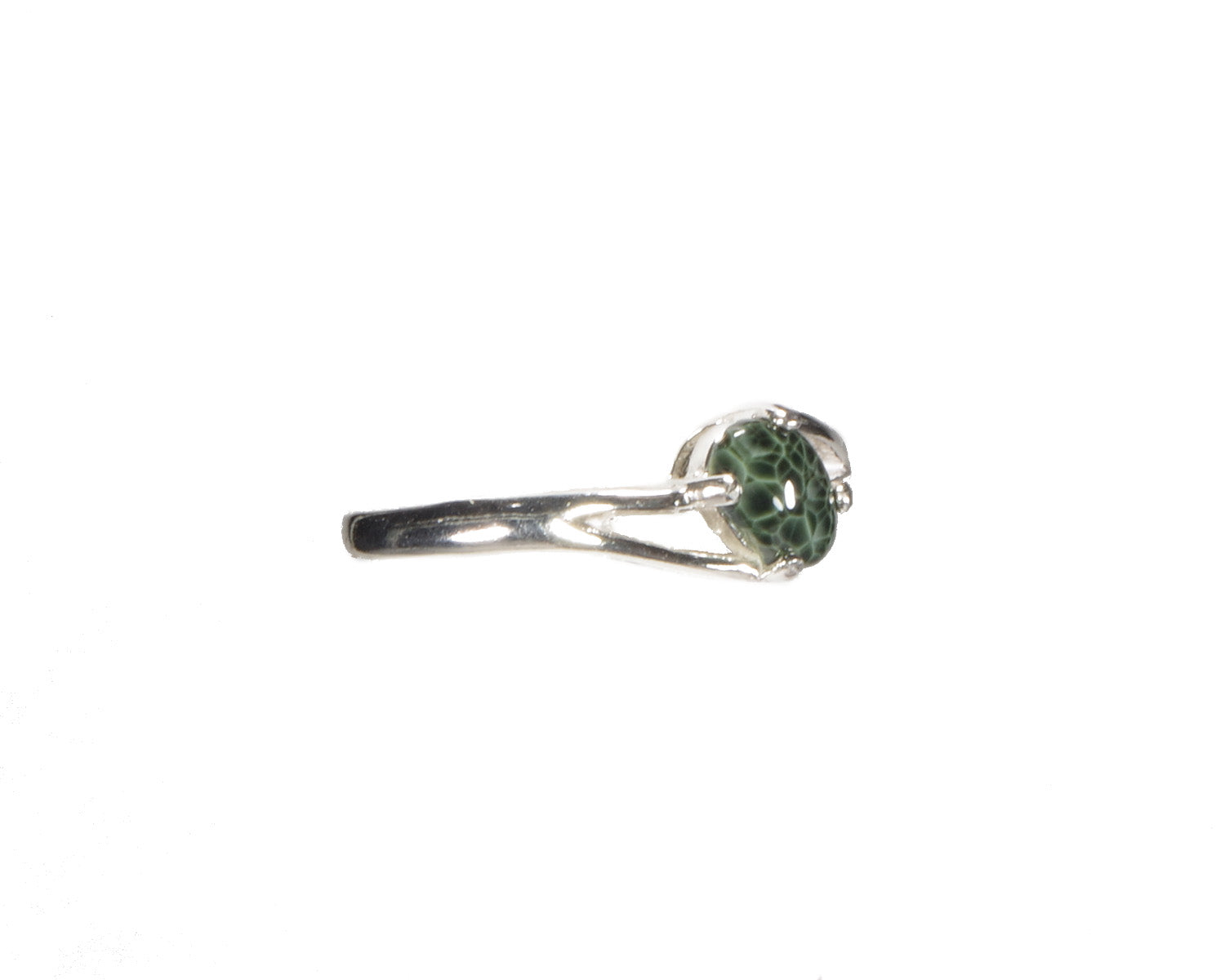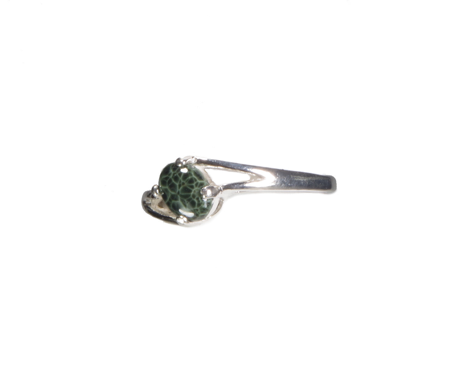 7 x 5mm Greenstone ring in a Sterling Silver 4-prong setting. This ring is sized to a 7. - Chlorastrolite (Greenstone) is the "official state gem" of Michigan. It is a variety of the mineral pumpellyite and is found chiefly as a small, green, rounded beach pebble, showing a turtleback...