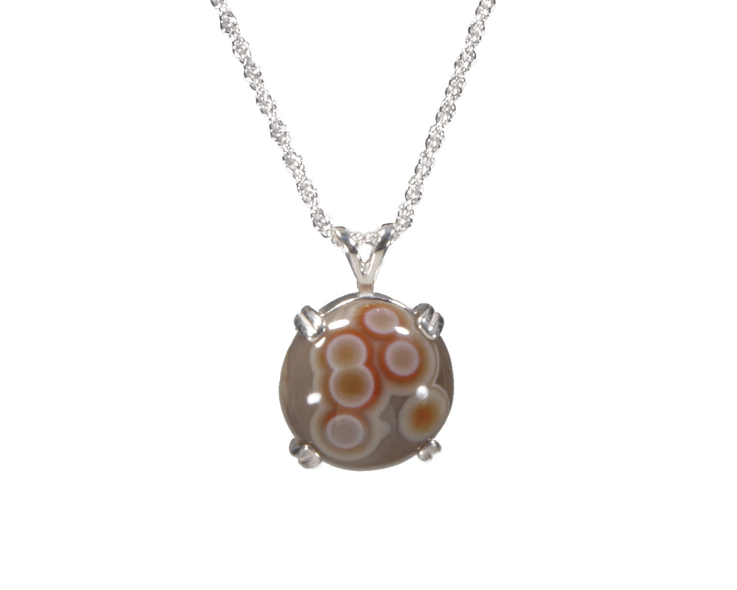 A 14 mm round Lake Superior Eye Agate pendant in a Sterling Silver 4 prong setting.