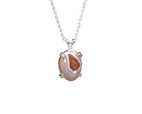 A 16mm x 12mm Lake Superior Agate pendant in a Sterling Silver 4 prong setting.