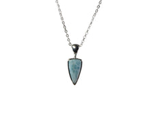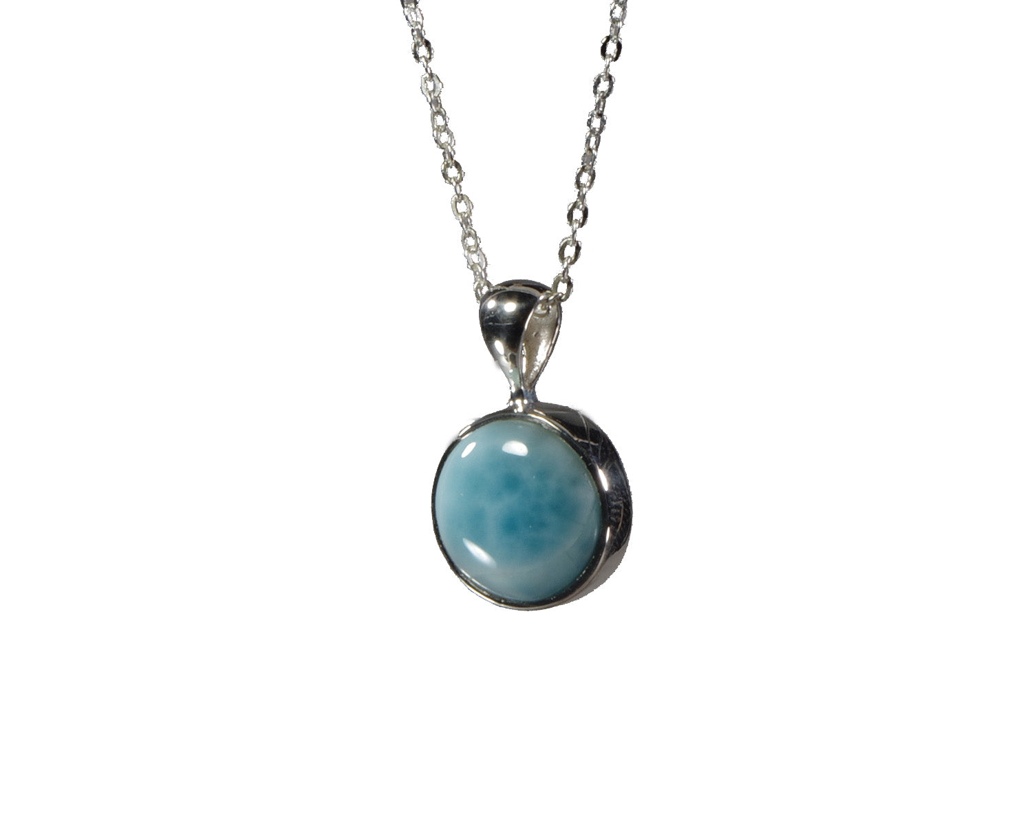 A 10mm round Larimar pendant in a Sterling Silver open back bezel setting on 18" chain with a spring ring clasp.